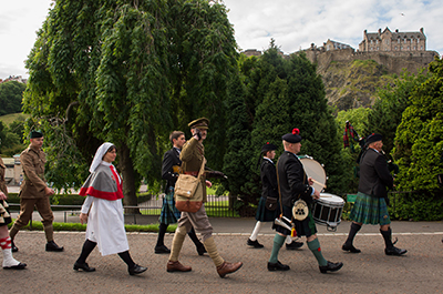 Organised by Wilfred Owen’s Edinburgh 1917-2017 – a committee consisting of representatives from Edinburgh Napier University, Scottish Poetry Library, Wilfred Owen Association, military charity Glen Art, Poppyscotland, and others - a unique re-enactment event took place at Waverley Station and along Princes Street this morning (26 June) as a programme of events to commemorate the centenary continued.