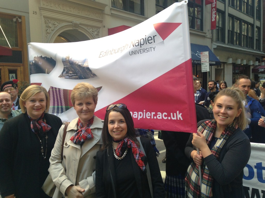 A pivotal part of the Week is the Parade. Edinburgh Napier alumni, friends and staff fly the flag for Scotland as they march down 6th Avenue to a chorus of bagpipes and drums.