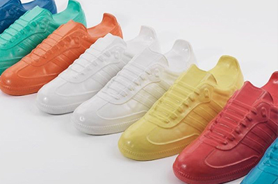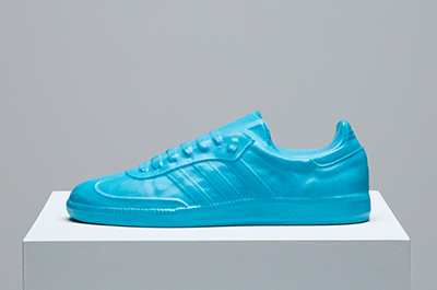 “They initially wanted a concrete cast pair of Sambas to reflect the band’s industrial aesthetic but I developed this into a conceptual installation artwork featuring a cast white marble pair of Sambas – the singer’s choice of colour – on a plinth and six rainbow coloured Portland Sambas set in beneath.