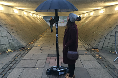A series of poetry umbrellas were also dotted around Edinburgh. Designed and created by students, the work drew on the imagery of the umbrella in the work of artists Francis Bacon and Rene Magritte, with passers-by having to step under an umbrella in order to hear poetry by Graham Brodie and Nick E Melville being played. The poetry aims to celebrate life while addressing issues of love, addiction, depression and mental wellbeing.
