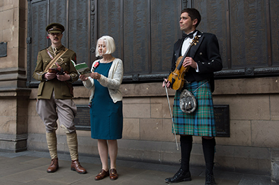 After the arrival, the event then replicated Owen’s initial journey along Princes Street, with the sound of pipers accompanying the party along Edinburgh’s main thoroughfare. A collection of World War One re-enactors from Scots in the Great War Living History Society and Poppyscotland collectors were also present along the street as they handed out leaflets of Owen’s poetry to passers-by. The party gathered outside the Caledonian Hotel – a location where Owen regularly met ‘the great and good’ of Edinburgh during his time in the city.