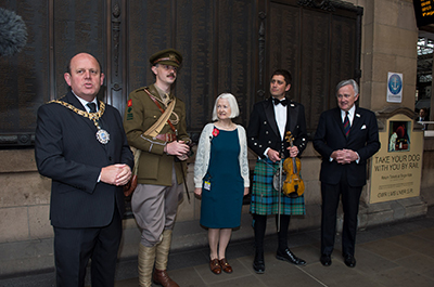 Arriving at platform seven on the Caledonian Sleeper, the event saw Owen, played by historian and teacher David Clarke, welcomed to the city by the Rt Hon Lord Provost and Lord Lieutenant of the City of Edinburgh Frank Ross and Norman Drummond, chair of the Scottish Government’s First World War Commemoration panel. The Caledonian Sleeper party were accompanied by Owen’s nephew, Peter, who also made the train journey to be part of the centenary commemorations.